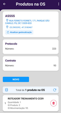 Ao acessar a tela “Produtos na OS”, você visualizará o resumo do atendimento no topo (Endereço, Protocolo e Contrato) e as seguintes funções de estoque: