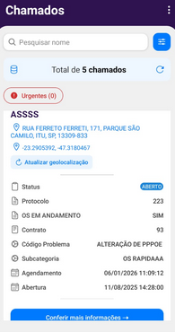 - Contador de Chamados: Exibe o total de ordens atribuídas a você (ex: “Total de 5 chamados”).