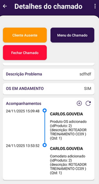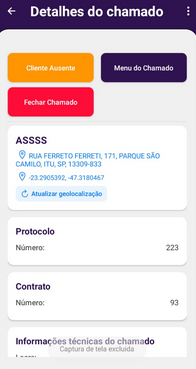 - 🟣 Menu do Chamado: Abre opções adicionais, como anexar fotos, equipamentos ou visualizar observações internas.