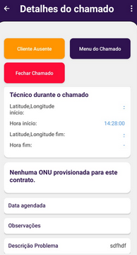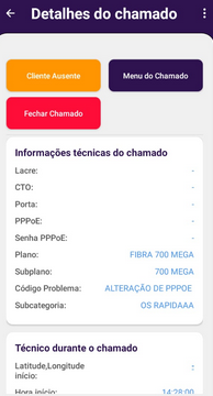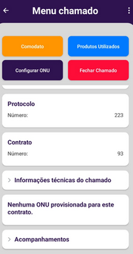Ao clicar no botão roxo “Menu do Chamado”, você terá acesso às ferramentas para registrar o que foi utilizado na visita e configurar equipamentos.