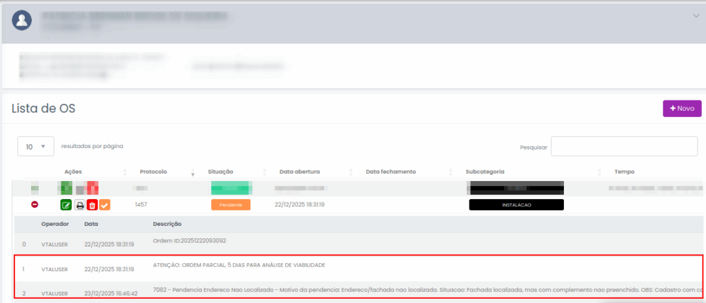 Observe abaixo que foi retornado que o motivo da pendência está relacionado ao endereço, sendo assim será necessário cancelar a OS de instalação e abrir uma nova OS.