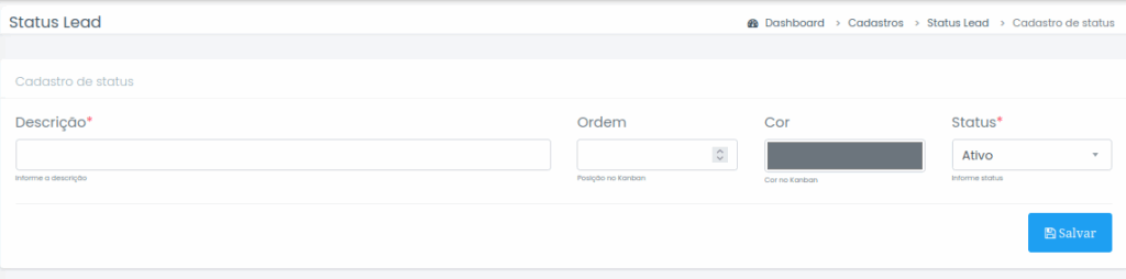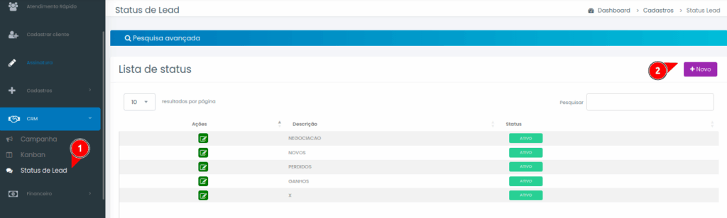 Para criar o status de leads é bem simples, basta seguir o exemplo abaixo:
