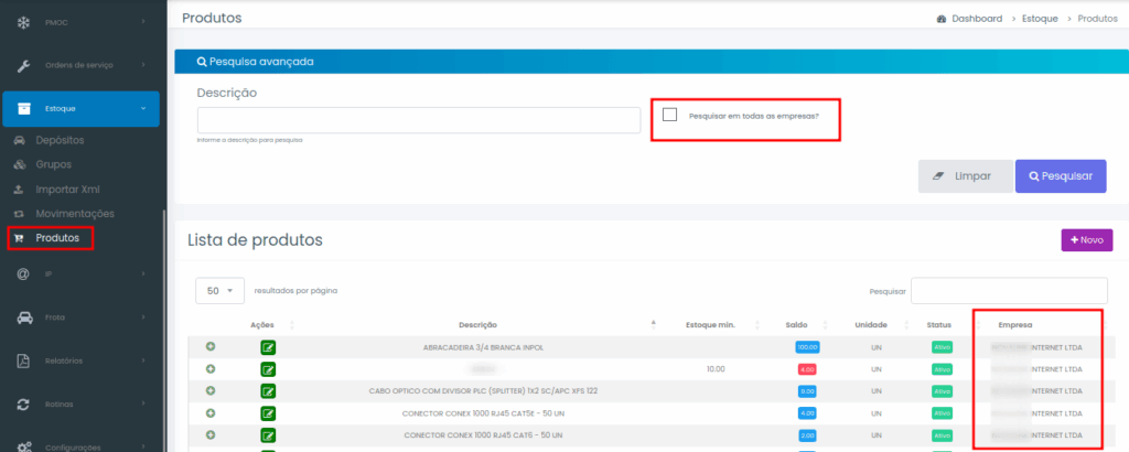 Para facilitar a gestão de estoque em grupos econômicos ou provedores com múltiplas filiais, agora é possível visualizar e buscar produtos de todas as empresas cadastradas sem precisar trocar o contexto do sistema.