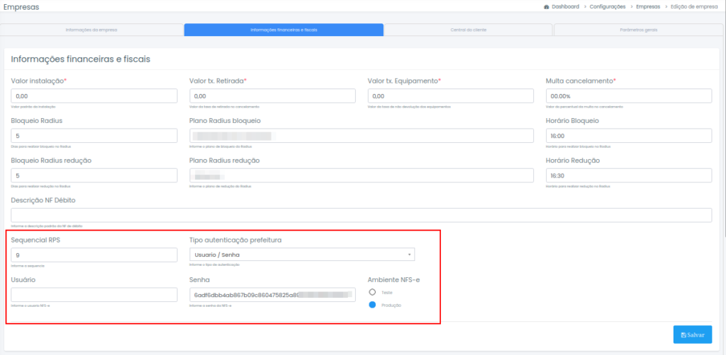 Passo 2: Após conferir essas informações iremos avançar para a 2ª Aba Informações Financeiras e Fiscais; Nela você irá preencher os seguintes campos: