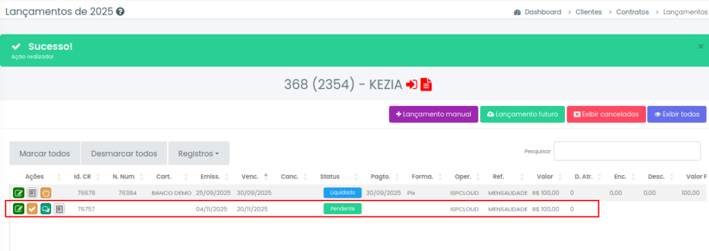 Passo 4: Após realizar as configurações acima é só realizar o lançamento do seu serviço, abaixo temos um lançamento no valor de 100$.