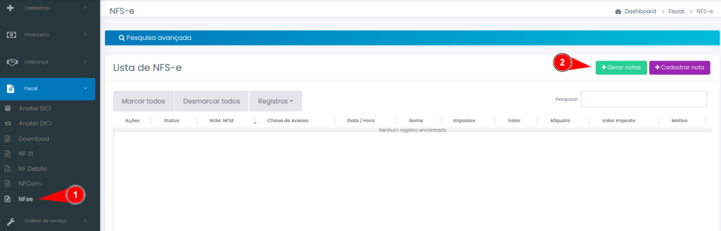 Agora iremos até o menu ‘Fiscal -> NFS-e -> Gerar Nota‘ para lançar a nota com base neste lançamento.