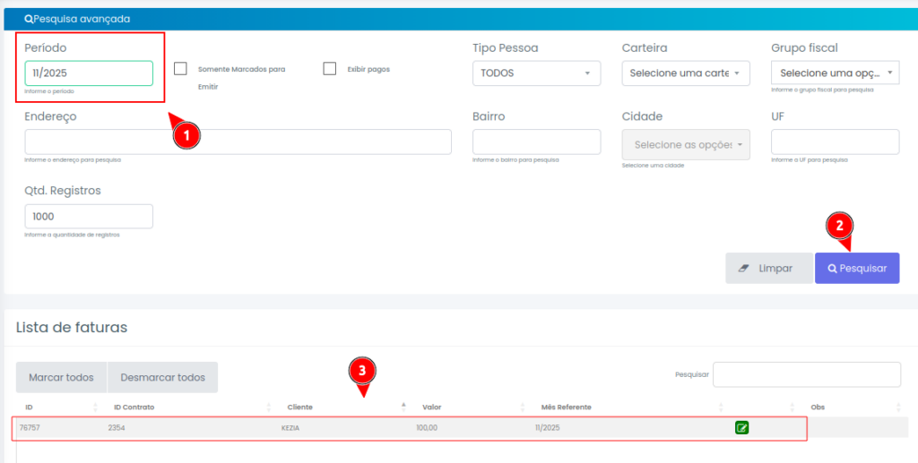 Passo 5: Ao clicarmos em +Gerar Nota, iremos inserir o periodo do lançamento e clicar em pesquisar para encontrarmos o lançamento.
