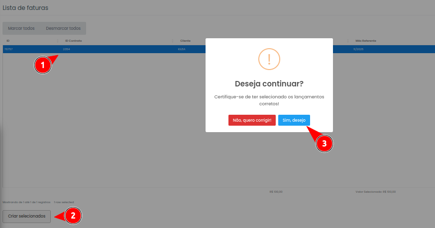 Passo 6: Por fim iremos selecionar o lançamento e clicar em Criar Selecionados.