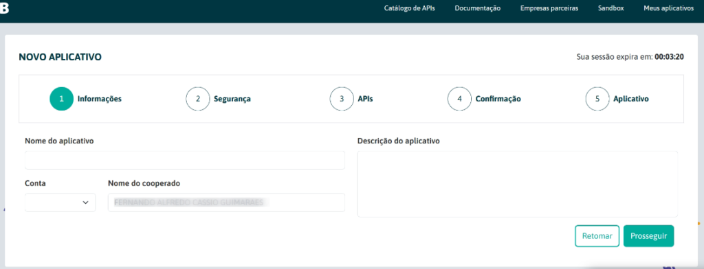 - Preencha as informações: Nome do Aplicativo, Descrição do Aplicativo, Conta
