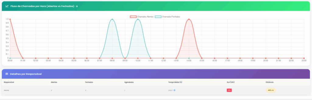Este gráfico demonstra o comportamento dos chamados ao longo do dia, comparando os horários de abertura e fechamento.