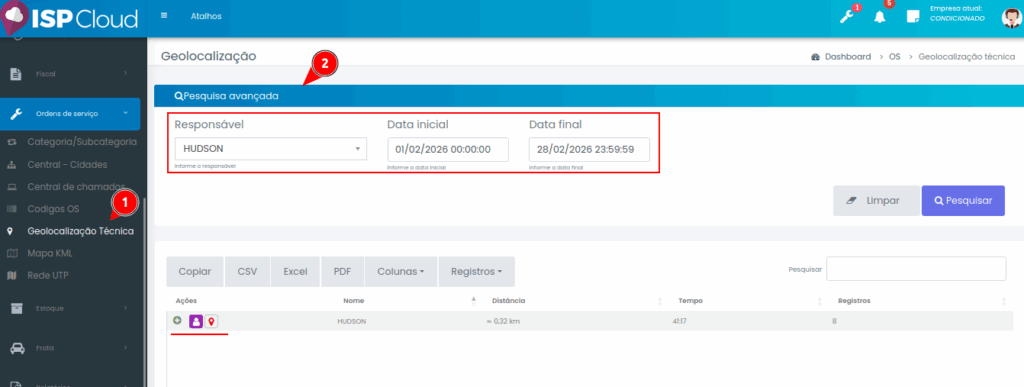 - Ícone de Mapa: Na coluna de ações, ao clicar no ícone de localização (marcador vermelho), o sistema abre o mapa detalhando os lugares onde o técnico andou.
