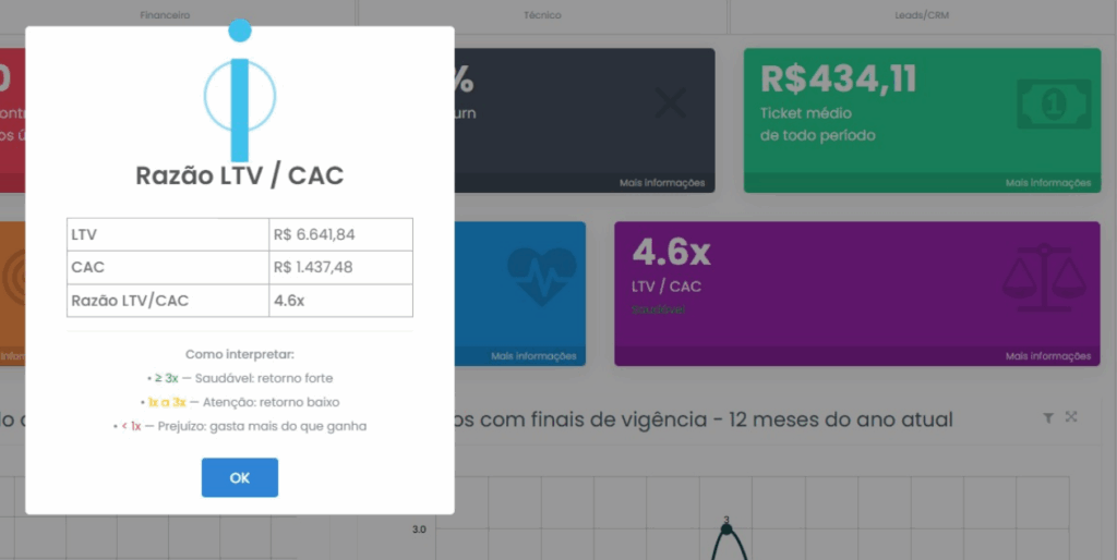 O card Razão LTV / CAC é, essencialmente, o termômetro de saúde financeira do seu negócio. Ele cruza os dois dados que vimos anteriormente para dizer se a sua operação é lucrativa no longo prazo.