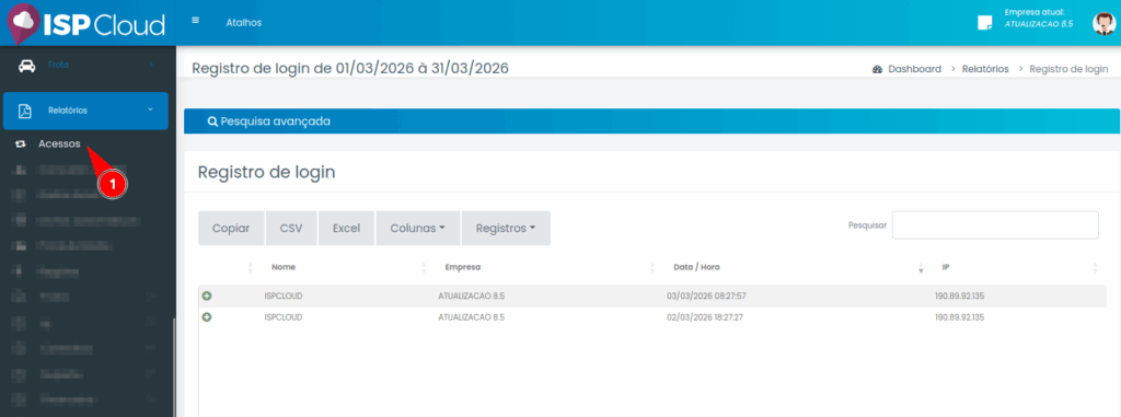 Caminho: Relatórios -> Acessos.