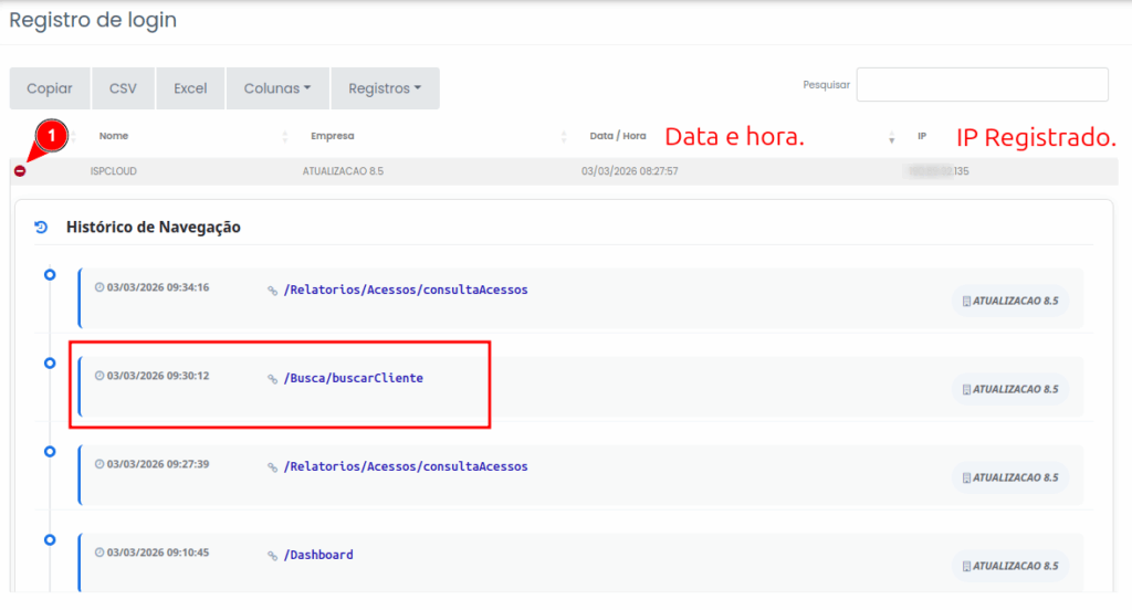 Identificação de Origem (IP): O sistema captura o endereço IP Registrado (ex: 000.00.00.135) de onde o acesso está partindo. Isso é fundamental para identificar se o acesso foi feito da rede interna do provedor ou de um local externo não autorizado.