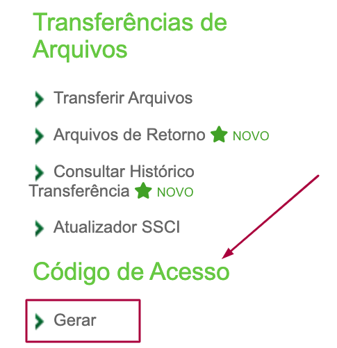 O menu “Código de Acesso”, que aparece no exemplo abaixo, está disponível apenas para beneficiários que aderiram ao produto Cobrança Online.