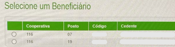Importante: Caso sua empresa tenha mais de uma conta Sicredi, e apareça mais de um beneficiário dentro do Internet Banking (conforme exemplo abaixo), selecione a opção que se refere a conta bancária cadastrada no Organizador PJ para gerar o código de acesso correto!