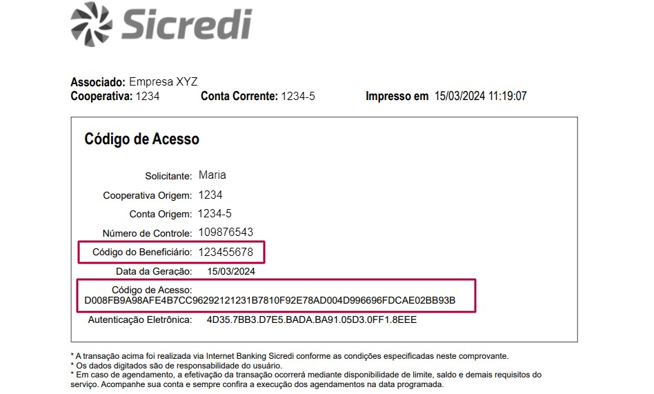 Para ativar a emissão de boletos na plataforma do Organizador PJ você precisa gerar a chave master (código de acesso) e o código do beneficiário no internet banking do Sicredi.