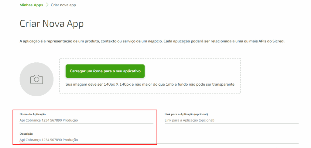 3º Passo: Preencha os campos “Nome da Aplicação” e “Descrição”.