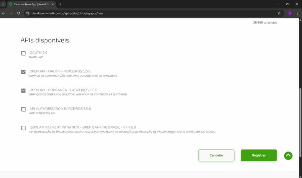 4º Passo: Logo abaixo desses campos, marque as opções “OPEN API – OAUTH PARCEIROS 1.0.0”, e “OPEN API – COBRANCA – PARCEIROS 1.0.0”, e clique em “Registrar“.