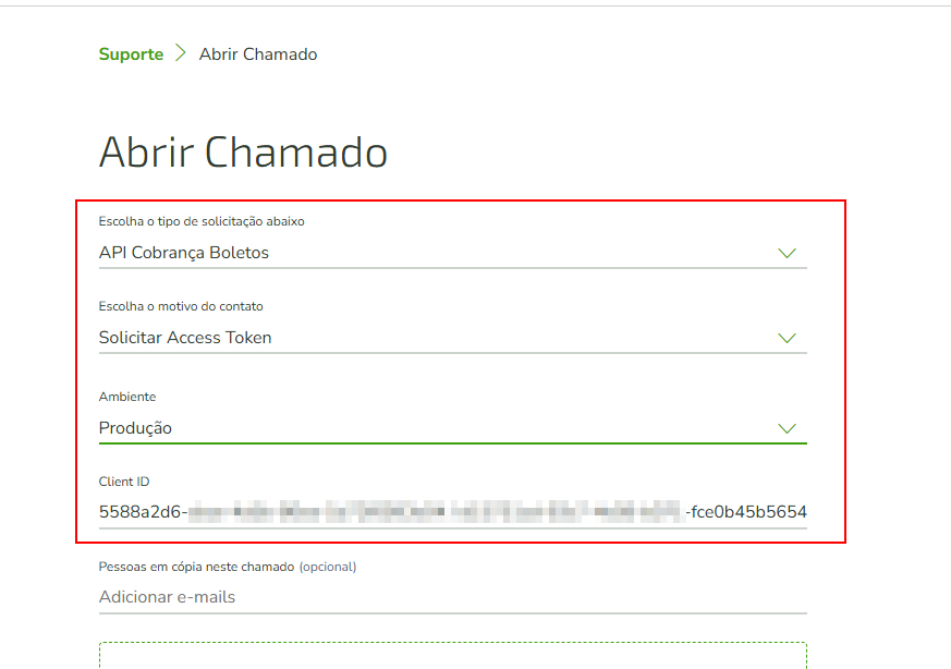 - Tipo de Solicitação: API Cobrança Boletos;